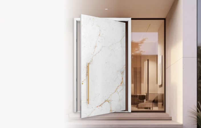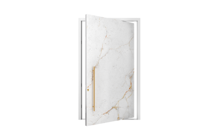 W naszej ekskluzywnej propozycji wypełnienia drzwiowego użyliśmy unikalnego spieku kwarcowego. Złote wzory wkomponowane w powierzchnię wypełnienia efektownie błyszczą na delikatnym białym tle o satynowym wykończeniu.