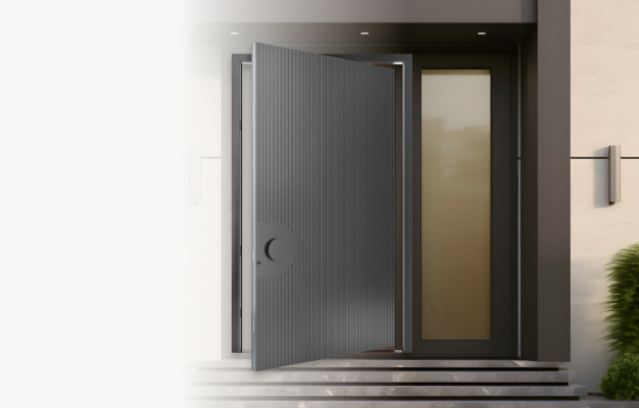 Frezowania na powierzchni wypełnienia drzwiowego są możliwe dzięki technologi tworzenia poziomych regularnych przetłoczeń na panelu aluminiowym.